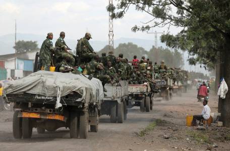 Government army FARDC soldiers drive in trucks as they arrive at Goma