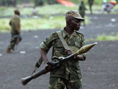 A government army FARDC soldier holds a rocket-propelled grenade (RPG) in the town of Sake, some 27 km (17 miles) west of Goma