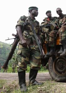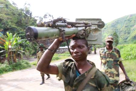 M23 rebel fighter carry weapon as they withdraw near the town of Sake