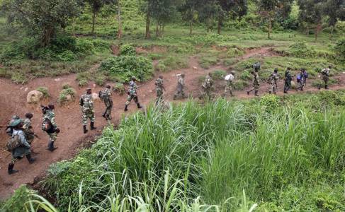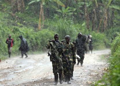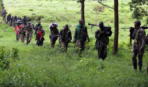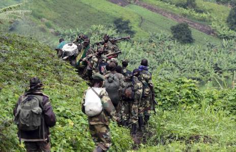 M23 rebel fighters walk as they withdraw near the town of Sake