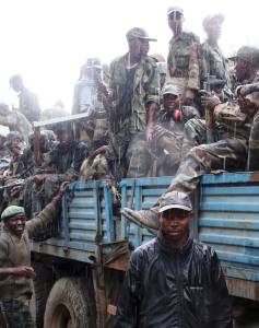 M23 rebel fighters sit in a truck as they withdraw near the town of Sake