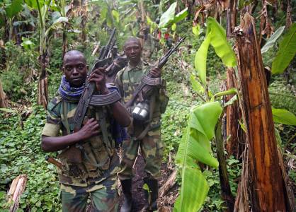 M23 rebel fighters rest as they withdraw near the town of Sake