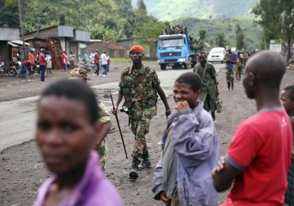 M23 rebel fighters walk past residents as they withdraw from the town of Sake