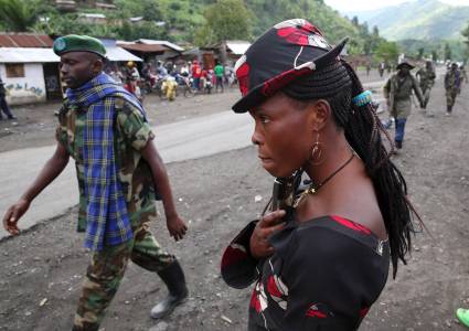 A M23 rebel fighter walks past a resident as they withdraw from the town of Sake