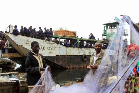 Fishermen arrange their nets as Congolese national police officers arrive on a ferry at a port at Lake Kivu