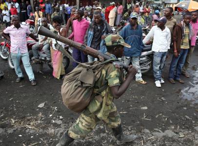 A M23 rebel fighter walks past residents as they withdraw from the town of Sake