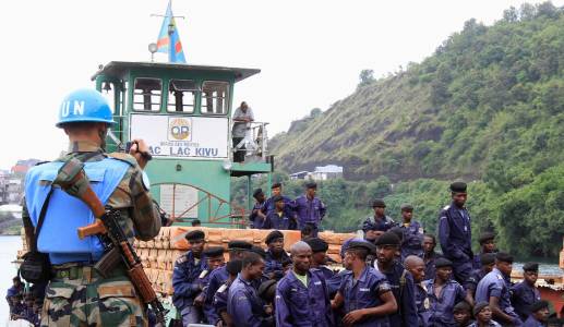 Congolese national police officers arrive at a port at Lake Kivu in Goma