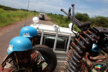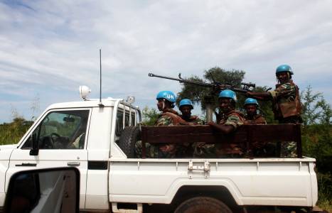 Ethiopian United Nations peacekeepers on trucks patrol the outskirts of the disputed Abyei town that straddles the border between Sudan and South Sudan September 16, 2013. REUTERS/Andreea Campeanu (SOUTH SUDAN - Tags: POLITICS CIVIL UNREST)
