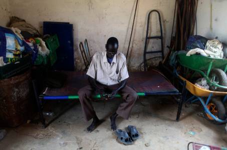 A South Sudanese man sits on his bed as he camps in an abandoned school that was destroyed in 2011 in South Sudan's Abyei town