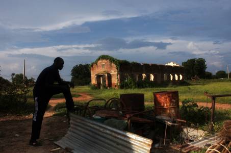 A man stands in front of a building destroyed in 2011 in South Sudan's Abyei town, September 15, 2013. Abyei, straddling the border between Sudan and South Sudan, is claimed by both sides, which fought one of Africa's longest civil wars. Since South Sudan's secession in 2011 after an independence vote, both countries have been unable to decide on the ownership of Abyei, which is inhabited by the Dinka tribe allied to South Sudan and the Misseriya, an Arab tribe following Sudan. REUTERS/Andreea Campeanu (SOUTH SUDAN - Tags: SOCIETY POLITICS CIVIL UNREST)