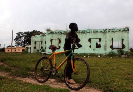 A boy pushes his bicycle in front of a building destroyed in 2011 in the Abyei region, September 14, 2013. Abyei, straddling the border between Sudan and South Sudan, is claimed by both sides, which fought one of Africa's longest civil wars. Since South Sudan's secession in 2011 after an independence vote, both countries have been unable to decide on the ownership of Abyei, which is inhabited by the Dinka tribe allied to South Sudan and the Misseriya, an Arab tribe following Sudan. REUTERS/Andreea Campeanu (SOUTH SUDAN - Tags: SOCIETY POLITICS CIVIL UNREST)