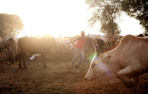 A South Sudanese child herds cows at dusk in Abyei town, in the disputed area of Abyei, September 15, 2013. Abyei, straddling the border between Sudan and South Sudan, is claimed by both sides, which fought one of Africa's longest civil wars. Since South Sudan's secession in 2011 after an independence vote, both countries have been unable to decide on the ownership of Abyei, which is inhabited by the Dinka tribe allied to South Sudan and the Misseriya, an Arab tribe following Sudan. REUTERS/Andreea Campeanu (SOUTH SUDAN - Tags: SOCIETY ANIMALS CIVIL UNREST POLITICS)
