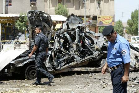 Iraqi security forces walk past damaged vehicles as they inspect the site of a car bomb attack in Basra, 420 km (261 miles) southeast of Baghdad, September 15, 2013. The attack in the oil-exporting southern city of Basra, where a car bomb blew up near another vehicle repair workshop killing five people, was one of several car and roadside bombs in Baghdad and predominantly Shi'ite provinces of Iraq killed at least 21 people on Sunday, police sources said. REUTERS/Essam Al-Sudani (IRAQ - Tags: CIVIL UNREST POLITICS)