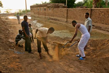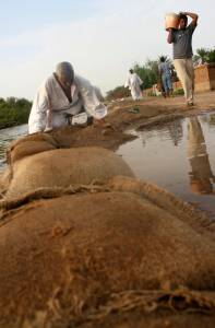 Men work to build a flood barrier to protect their houses from the rising water of the White Nile River in South Khartoum