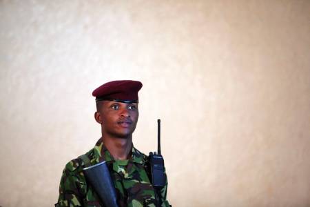 Congolese Revolution Army (CRA) rebel fighter stands guard as leader of the March 23 Movement (M23) Jean-Marie Runiga is addressing the media in Goma