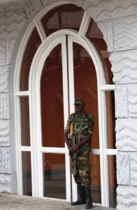 Congolese Revolution Army (CRA) rebel fighter stands guard outside the hotel entrance where leader of the March 23 Movement (M23) Jean-Marie Runiga is addressing the media in Goma