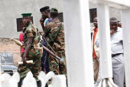 Congolese Revolution Army (CRA) rebel fighters stand guard outside the hotel entrance where leader of the March 23 Movement (M23) Jean-Marie Runiga is addressing the media in Goma