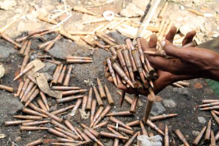 A CRA fighter collects bullets from the floor at a military barracks, abandoned by fleeing government soldiers early this week as they capture Goma in the Democratic Republic of Congo