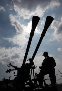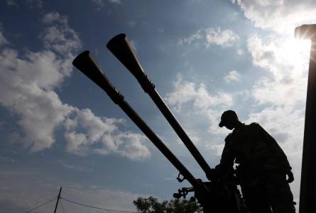 A CRA fighter stands atop an anti-aircraft gun, abandoned by fleeing government army following the capture of Goma in the Democratic Republic of Congo