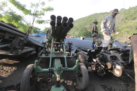 CRA fighters show to the media military arsenals abandoned by fleeing government army, following the capture of Goma in the Democratic Republic of Congo