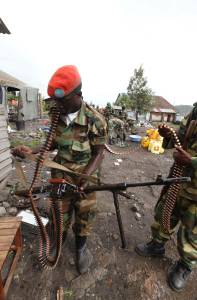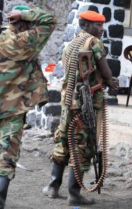A CRA fighter holds his weapon at a military barracks, abandoned by fleeing government army following the capture of Goma in the Democratic Republic of Congo