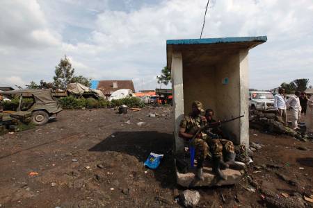 CRA fighters guard the entrance into military barracks in Goma, abandoned by fleeing government army following the capture of Goma in the Democratic Republic of Congo