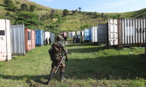 A CRA fighter guards containers storing arms, abandoned by fleeing government army following the capture of Goma in the Democratic Republic of Congo