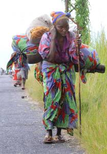 A displaced woman carries her belongs as she walks on a road fleeing from renewed fighting between Congolese Revolutionary Army (CRA) and government army near Sake