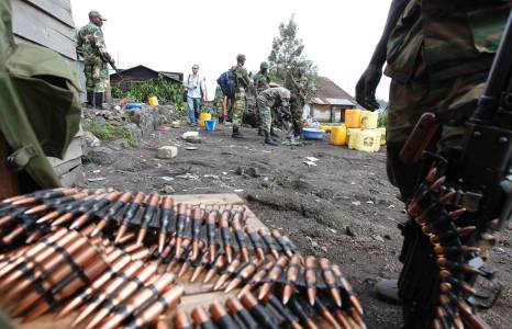 A CRA fighter stands next to a pile of bullets, abandoned by fleeing government soldiers early this week as they capture Goma in the Democratic Republic of Congo
