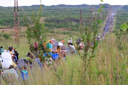 Displaced families walk towards Goma as they flee from renewed fighting between the Congolese Revolutionary Army (CRA) and Congolese army in Sake