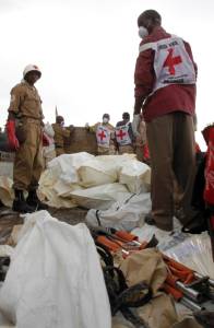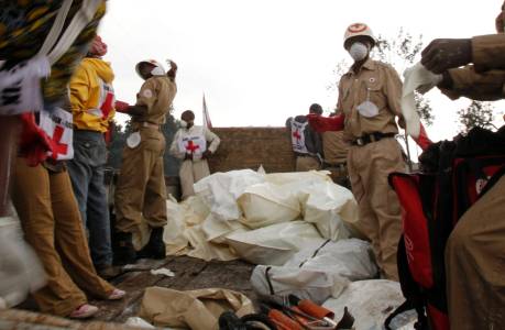 Red Cross workers collect bodies in body bags to load onto a truck in Ndosho near Goma