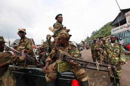 Congolese Revolution Army rebels sit in a truck as they patrol a street in Sake