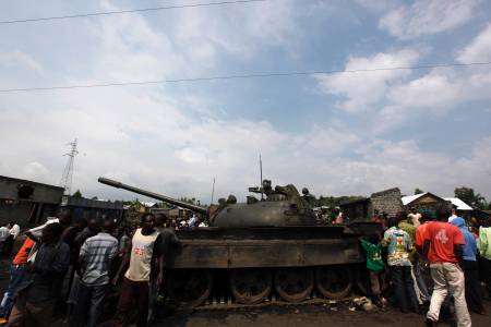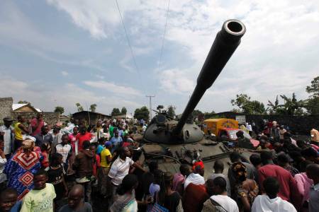 People gather around a tank abandoned by fleeing Congolese army in Ndosho near Goma