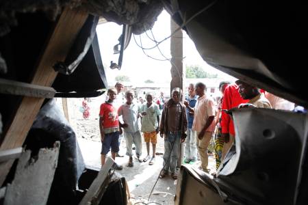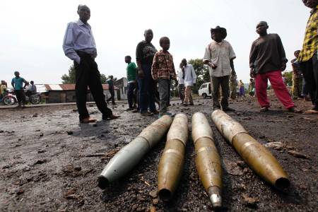 People gather around tank shells abandoned by fleeing Congolese army in Ndosho near Goma