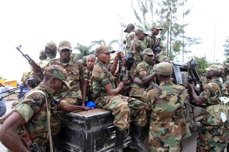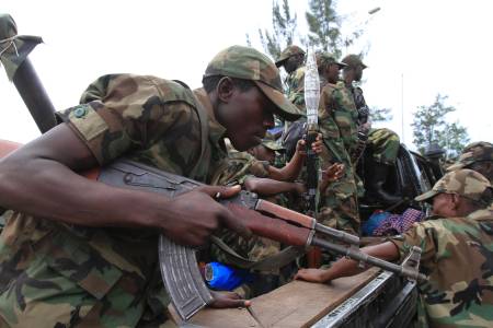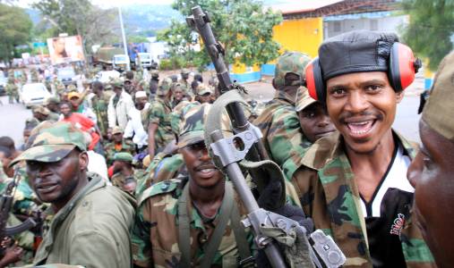 Congolese Revolution Army rebels sit on a truck as they patrol a street in Goma in the eastern Democratic Republic of Congo, soon after the rebels captured the city from the government army