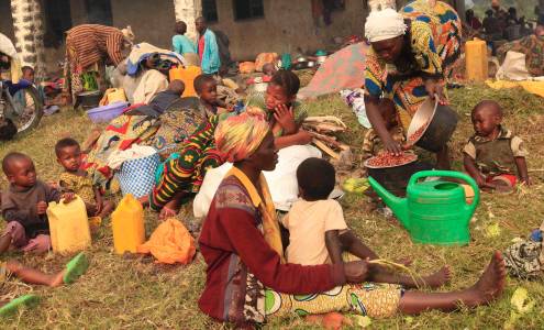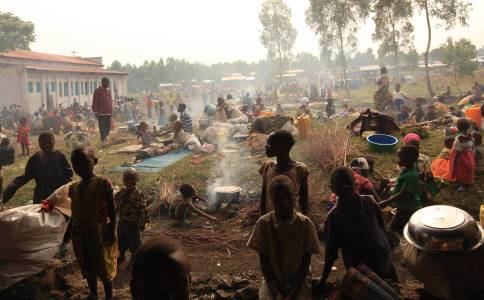 Families who fled from renewed fighting between government troops and M23 rebels gather in Kibati in near eastern Congolese town of Goma
