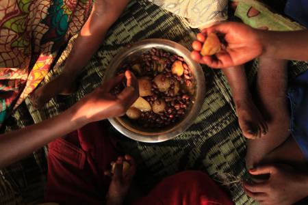 Families who fled from renewed fighting between government troops and M23 rebels gather in Kibati near the eastern Congolese town of Goma