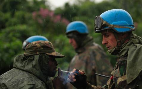 UN peace keeper lights cigarette for a government soldier in Kibumba in eastern Congo