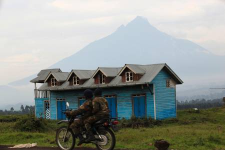 Government soldiers ride on motor bike past an abandoned house in Kibumba in eastern Congo