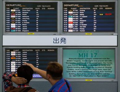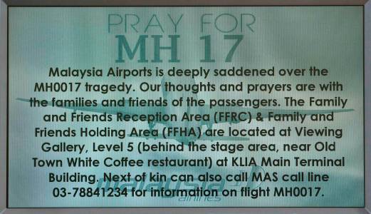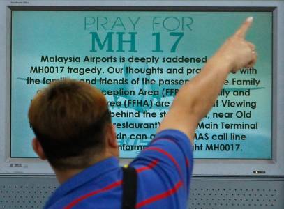 "Pray for MH17" message is displayed on a flight information board at Kuala Lumpur International Airport in Sepang