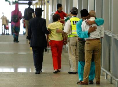 REFILE - CORRECTING GRAMMAR A man (in blue), whose family was onboard Malaysia Airlines MH17, consoles another man who had just arrived with his wife to receive confirmation that their daughter's family was onboard the plane, at Kuala Lumpur International Airport in Sepang July 18, 2014. The United States believes a surface-to-air missile brought down a Malaysian airliner that crashed in eastern Ukraine on Thursday, killing all 298 people on board, an incident that sharply raises the stakes in a conflict between Kiev and pro-Moscow rebels. REUTERS/Edgar Su (MALAYSIA - Tags: TRANSPORT DISASTER)