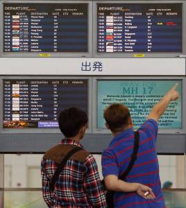 Bystanders look at a board displaying flight information and a "Pray for MH17" message at Kuala Lumpur International Airport in Sepang July 18, 2014. World leaders demanded an international investigation into the shooting down of a Malaysian airliner over eastern Ukraine in which all 298 people on board were killed, a tragedy that could further heighten tensions between Russia and the West. REUTERS/Edgar Su (MALAYSIA - Tags: TRANSPORT DISASTER)
