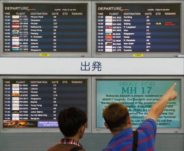 Bystanders look at board displaying flight information and a "Pray for MH17" message at Kuala Lumpur International Airport in Sepang