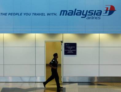 Security officer passes a Malaysia Airlines advertisement at the Kuala Lumpur International Airport in Sepang