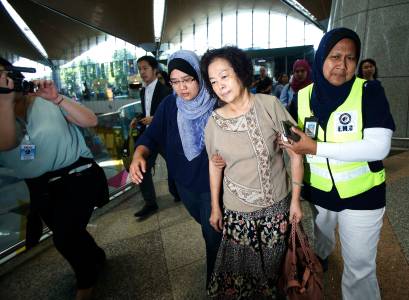 Relative of a passenger onboard MH17 is assisted by MAS staff members as she leaves Kuala Lumpur International Airport in Sepang