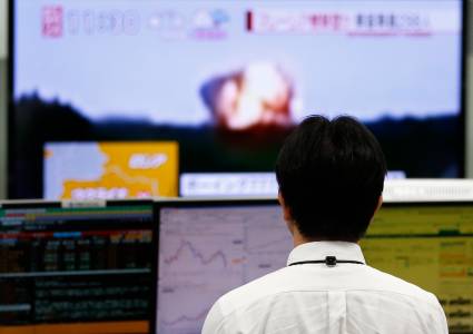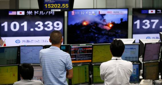 Employees of a foreign exchange trading company look at monitor displaying a TV programme featuring the downed Malaysian Airlines MH17, as other monitors displaying the Nikkei share average (top) ,the exchange rates between the Japanese yen and the U.S. dollar (L) and the yen against the euro (R) are pictured, in Tokyo July 18, 2014. Asian shares sagged in early trading and a drop in Treasury yields pressured the dollar after news of a downed Malaysian airlines jet at the Ukraine-Russia border sent investors scurrying into defensive assets. REUTERS/Toru Hanai (JAPAN - Tags: BUSINESS TRANSPORT DISASTER)