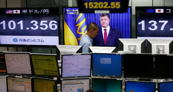 An employee of a foreign exchange trading company walks past a monitor showing Ukrainian President Petro Poroshenko, as other monitors displaying the Nikkei share average (top), the exchange rates between the Japanese yen and the U.S. dollar (L) and the yen against the euro (R), in Tokyo July 18, 2014. Asian shares sagged in early trading and a drop in Treasury yields pressured the dollar after news of a downed Malaysian airlines jet at the Ukraine-Russia border sent investors scurrying into defensive assets. REUTERS/Toru Hanai (JAPAN - Tags: BUSINESS TRANSPORT DISASTER POLITICS)