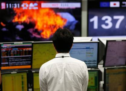Employees of foreign exchange trading company work near monitors displaying Nikkei share average and a TV programme featuring the downed Malaysian Airlines MH17, in Tokyo