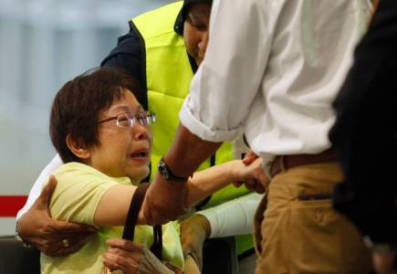 Malaysian Siti Dina weeps after seeing her daughter's name on the list of passengers on board Malaysia Airlines MH17 at the Kuala Lumpur International Airport in Sepang July 18, 2014. The United States believes a surface-to-air missile brought down the Malaysian airliner that crashed in eastern Ukraine, killing all 298 people on board, an incident that sharply raises the stakes in a conflict between Kiev and pro-Moscow rebels. Her daughter Shelisa Zaini, Shelisa's Dutch husband and their three children were on board the plane en-route to Melbourne, Australia. REUTERS/Edgar Su (MALAYSIA - Tags: TRANSPORT DISASTER)