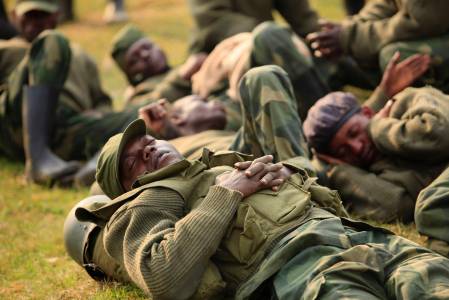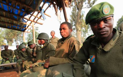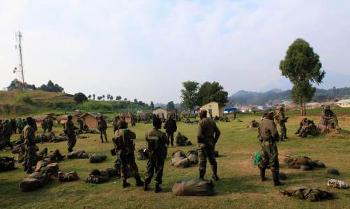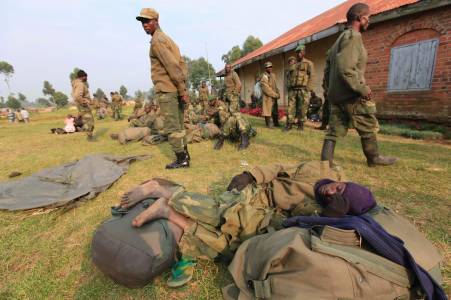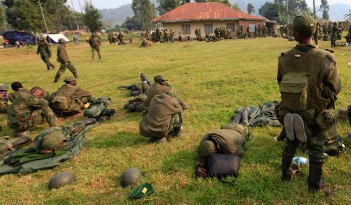Soldiers from Democratic Republic of Congo rest in a field in Uganda border town of Kisoro